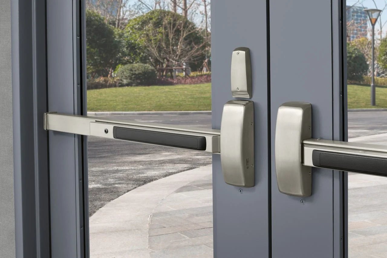 Panic bars, Door closers, Mortise locks, Dead bolts, Push paddles, Swing up bolts.